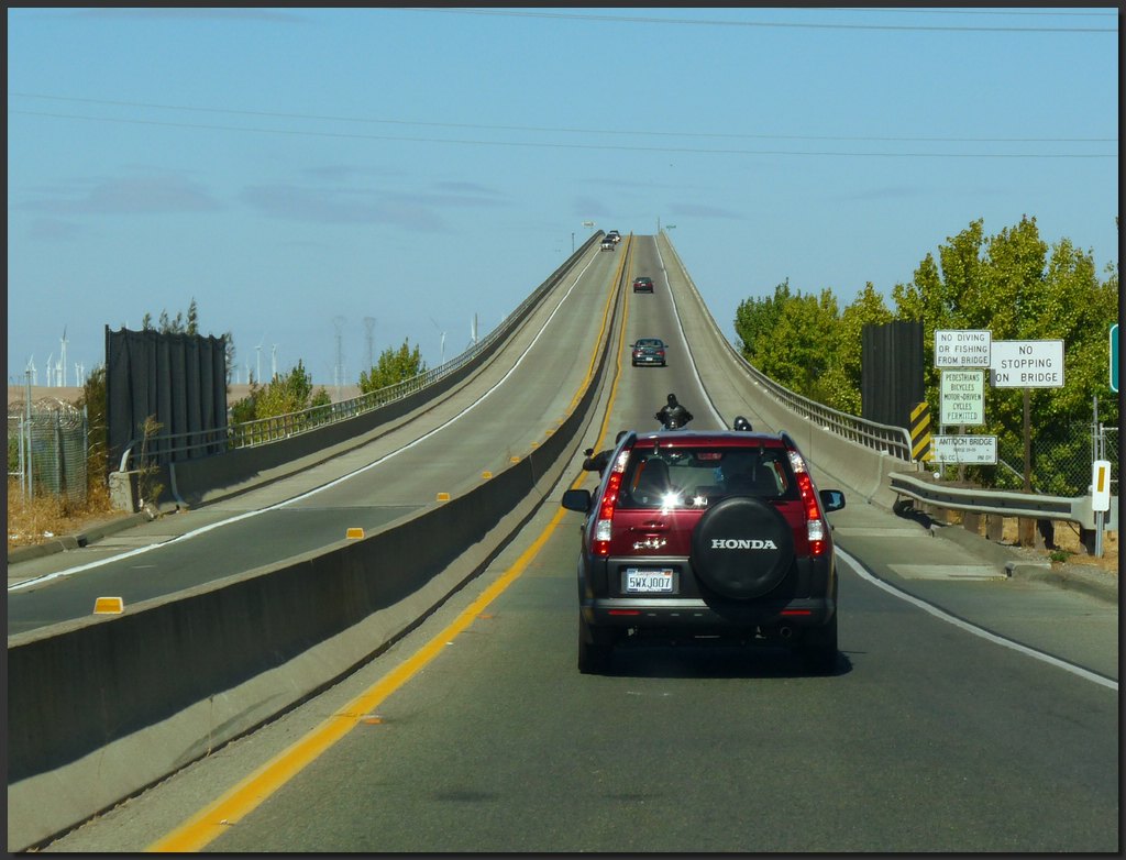Heading up the single lane per side CA-160 bridge